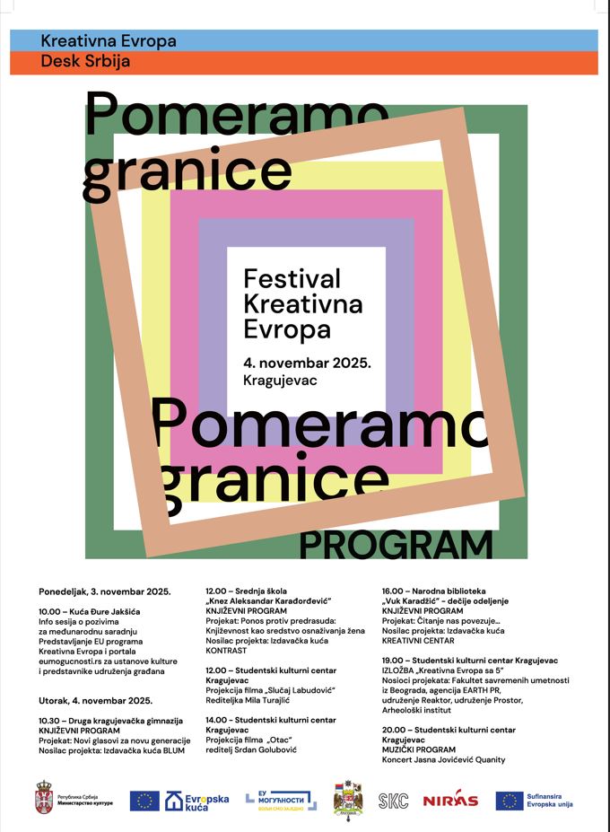 Kragujevac će od 2. do 6. novembra 2025. biti domaćin Festivala Kreativna Evropa, manifestacije koja promoviše najbolje projekte iz Srbije podržane kroz program Evropske unije – Kreativna Evropa. Festival organizuju Desk Kreativna Evropa Srbija, Evropska kuća, projekat EU programi podrške, Grad Kragujevac i Studentski kulturni centar Kragujevac, uz podršku brojnih institucija i organizacija koje doprinose jačanju kulturne saradnje i evropskih vrednosti.