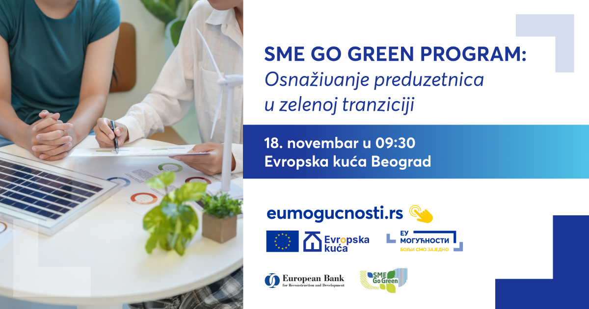 Radionica „SME Go Green“, koju organizuje Evropska banka za obnovu i razvoj (EBRD) u saradnji sa Evropskom kućom u Beogradu, posvećena je razvoju i podršci malim i srednjim preduzećima kojima upravljaju žene, sa posebnim akcentom na mogućnostima finansiranja zelenih investicija i uvođenju održivih poslovnih modela.