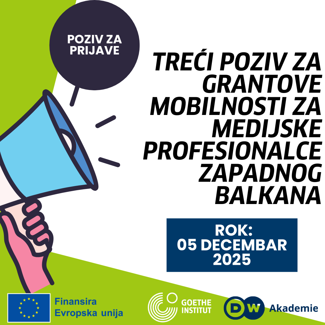 Treći poziv za međunarodne grantove mobilnosti otvoren je za medijske profesionalnce koji su potpisali memorandum o razumevanju sa Goethe-Institutom i DW Akademijom. Oni će imati priliku da učestvuju u programu „job-shadowing“ u okviru javnih servisa Evropske unije ili Zapadnog Balkana, uglednih medijskih instituta, centara za medijsku obuku i sličnih institucija.